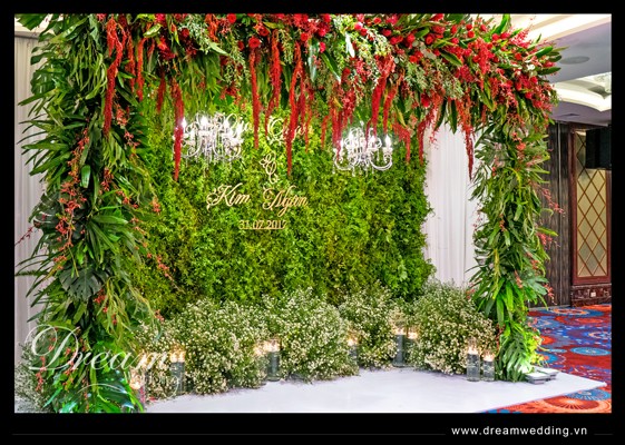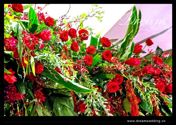 Trang trí tiệc cưới, trang trí đám cưới tại Windsor - vòm hoa tươi phông màu đỏ phía trên phông chụp hình