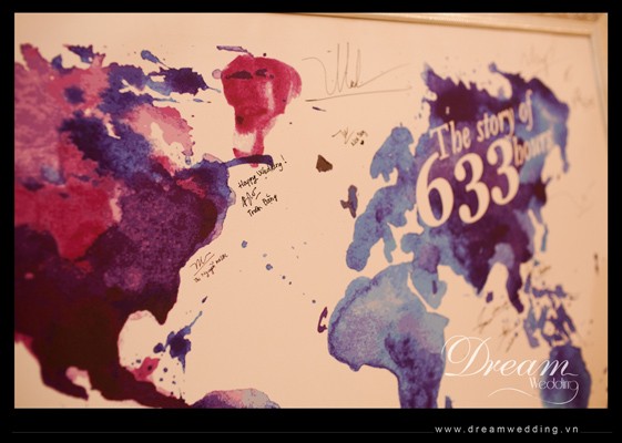 Sổ kí tên được thiết kế riêng với hình bản đồ thế giới dùng để lưu lại chữ kí của những người thân đến dự tiệc