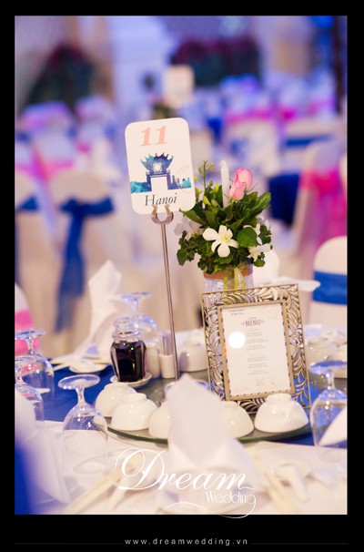 Mỗi bàn tiệc được trang trí hoa tươi và khung hình gắn menu món ăn
