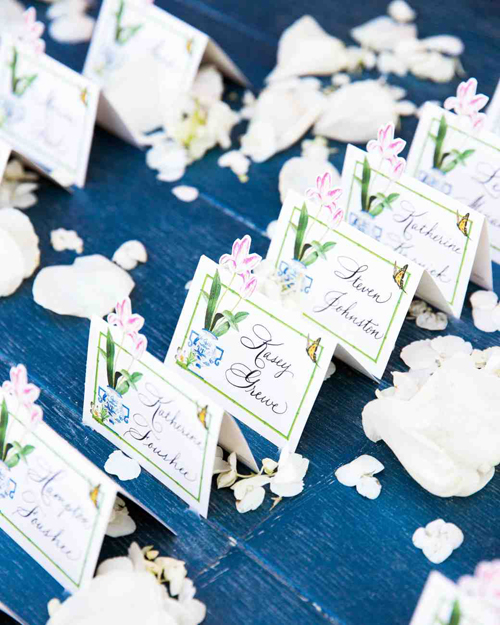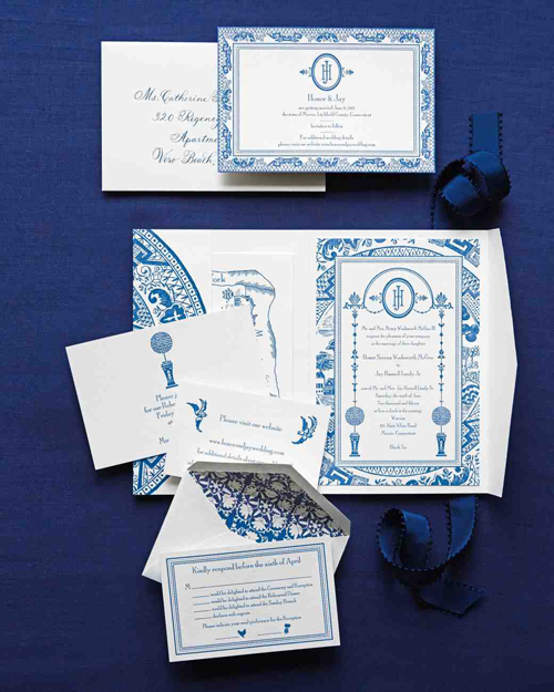 Thiệp mời tone xanh lam - trắng theo đúng chủ đề hoa văn sứ.