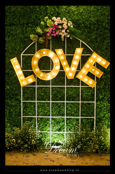 Trang trí tiệc cưới tai Rex Hotel, trang trí đám cưới - phông chụp hình chữ love điện phía trên