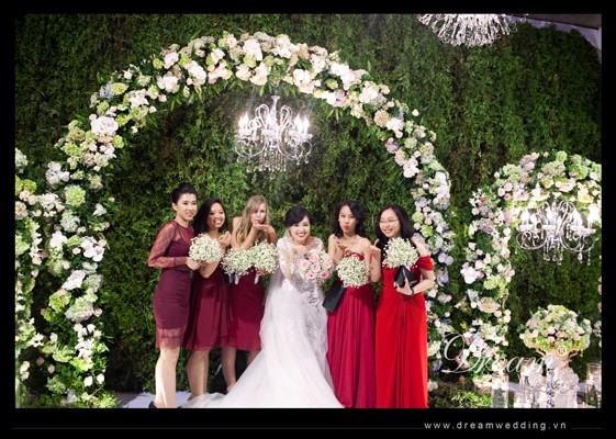Đám cưới Tuấn Khương & Phương Vy tổ chức tại sảnh tiệc cưới sang trọng của khách sạn 5 sao Intercontinental. Theo yêu cầu của cô dâu & chú rễ, đội ngũ Dream Wedding đã thiết kế và trang trí tiệc cưới của anh, chị theo tông màu chủ đạo là trắng xanh cốm, kết hợp với màu hồng dâu.