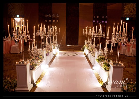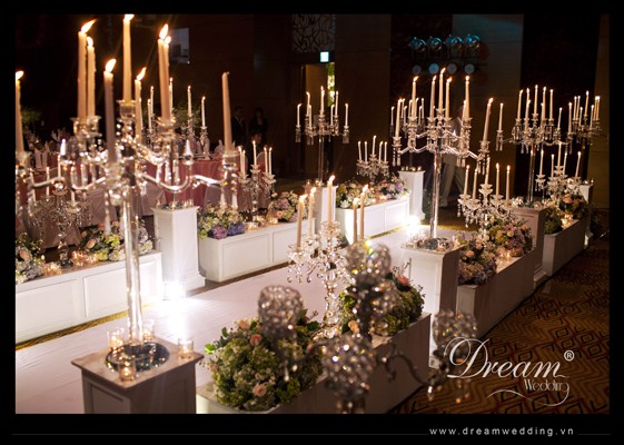 Nến được thắp lên dọc theo lối đi sân khấu để làm tăng thêm sự lung linh của buổi tiệc