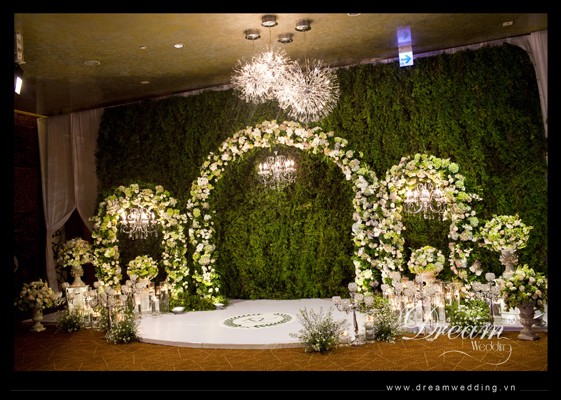 Qua khu vực lối đi là phông chụp hình rộng lớn dành cho khách dự tiệc, phông chụp hình được thiết kế với 3 cổng hoa tươi đặt xen kẻ nhau, phông lá xanh được làm nền phía sau làm nổi bật các đôn hoa tươi và phụ kiện phía trước