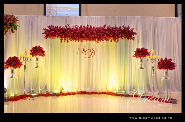 Sân khấu được trang trí với các vòng cong hoa tươi đỏ rực theo tông màu chủ đạo của buổi tiệc