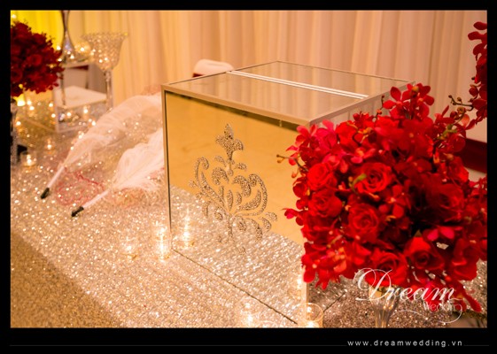 Với đám cưới của cặp đôi Quang Anh và Thùy Dung tổ chức tại trung tâm hội nghị tiệc cưới White Palace, tông màu trang trí chủ đạo cũng là màu đỏ. Nhưng để sắc đỏ không nhàm chán, ê-kíp thực hiện đã chọn thêm những gam màu bổ trợ, tạo thành bộ màu trang trí đám cưới gồm đỏ - trắng - bạc, khiến không gian thêm sang trọng, rực rỡ mà hiện đại, trẻ trung. Sau đây mời các bạn tham khảo những hình ảnh trang trí trong đám cưới của anh, chị:
