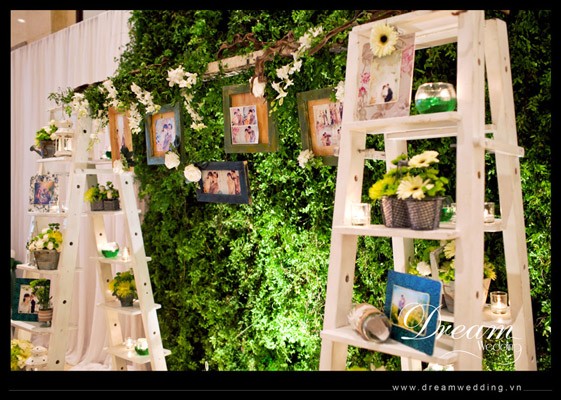 Bình hoa và những khung hình CD & CR được treo trên thang gỗ