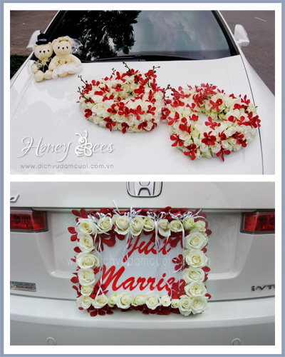 Hoặc là những cầu hoa tươi từ nhỏ đến lớn xếp thẳng hàng phía trước mui xe và sau đuôi là bảng just married