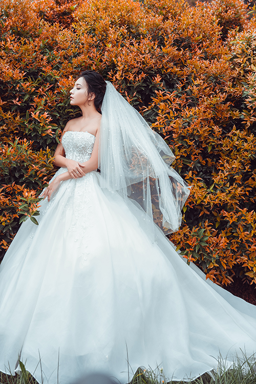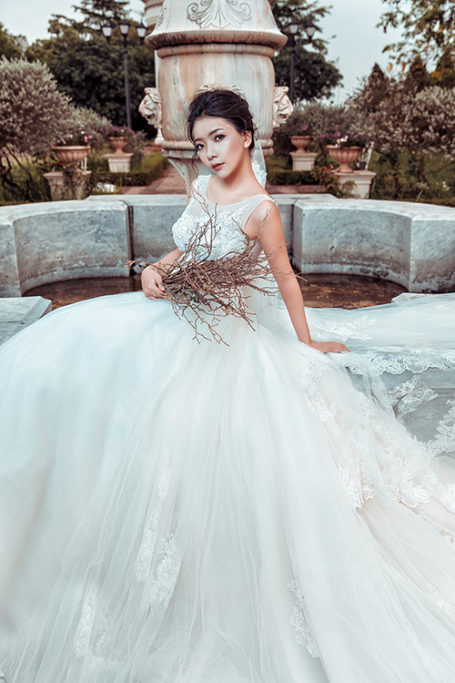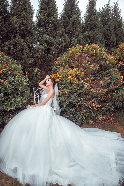 Đuôi váy dài bồng bềnh làm từ nhiều lớp voan siêu nhẹ, tạo sự thướt tha, uyển chuyển khi di chuyển.