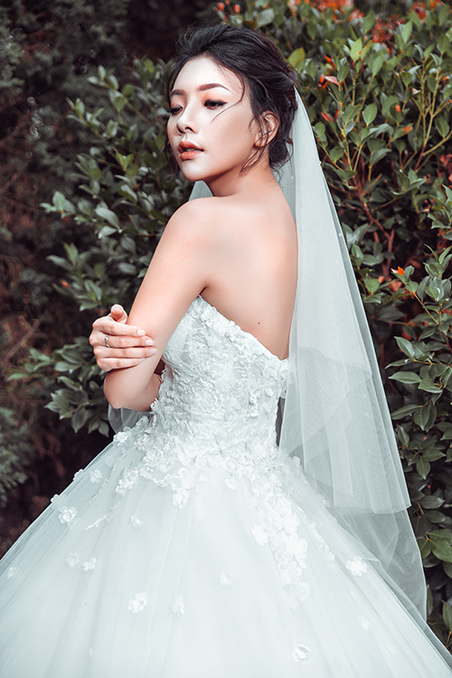 Váy cưới dáng bồng giúp tôn lên vẻ đẹp nhẹ nhàng, nữ tính của cô dâu Phương Đông, nhưng vẫn thể hiện được sự gợi cảm qua đường cong ở eo, cúp ngực hay đường cắt mềm mại ở sau lưng.