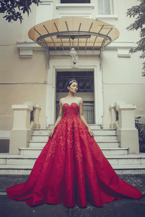 Trong bộ sưu tập này, xen lẫn họa tiết ren thêu nổi là chi tiết đính đá pha lê lấp lánh khiến bộ trang phục thêm bắt mắt. Những khoảng vải trong suốt để lộ da thịt ở ngực càng khiến mẫu váy thêm gợi cảm.