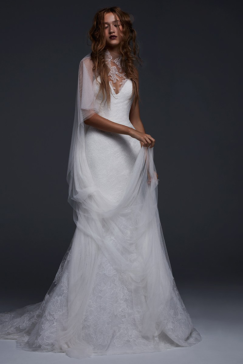 Nhà thiết kế sử dụng chất liệu ren lưới mỏng manh thay thế cho họa tiết trang trí, nhờ đó, chiếc váy cưới không bị nặng nề.