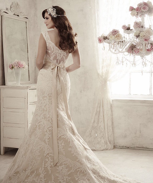 Váy với dạng cổ yếm và đính kết cầu kỳ, khiến mọi người tập trung sự chú ý vào eo và hông gợi cảm của cô dâu.