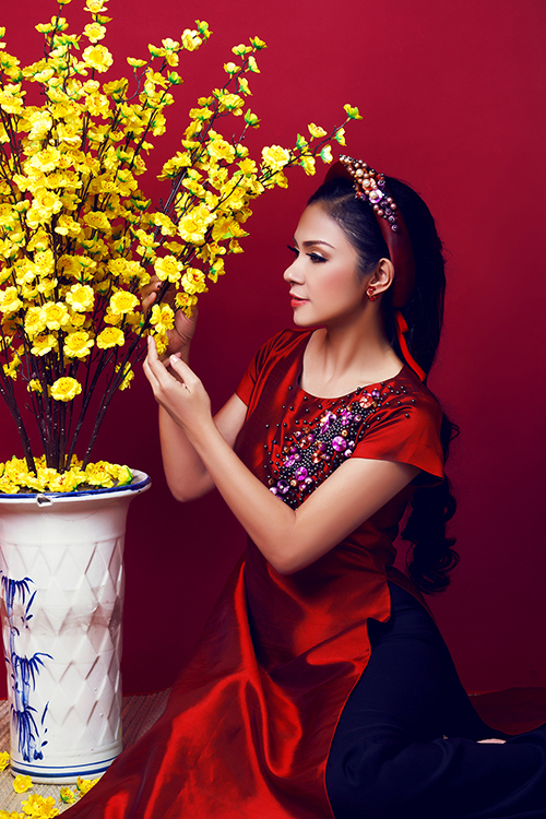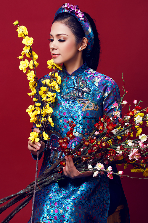 Việt Trinh rạng rỡ trong trang phục áo dài gấm trung niên