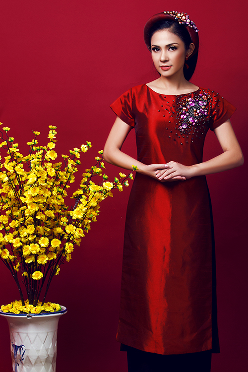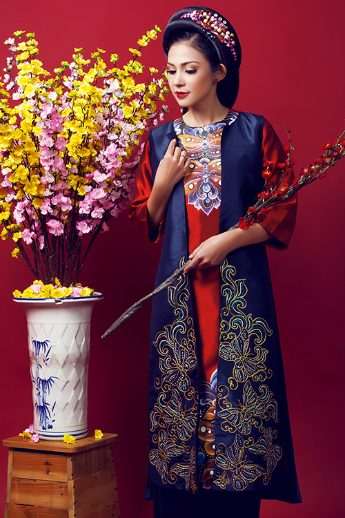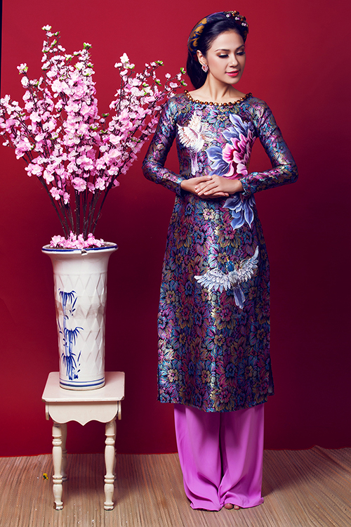 Kỹ thuật thêu 3D trên nền vải gấm khá phức tạp vì mặt vải dễ bị xước, nhăn nhúm. Phom áo dài không gò bó với cảm hứng từ thời trang những năm 70.