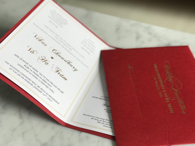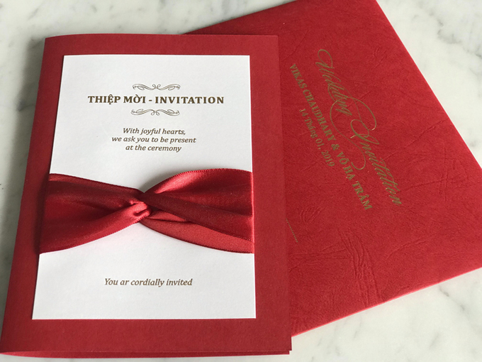 Gần 2 tuần trước ngày đại hỷ, uyên ương dần hoàn tất các khâu chuẩn bị. Cả hai đã hoàn thiện thiệp cưới để gửi tận tay từng khách mời. Tấm thiệp được thiết kế đơn giản với tông đỏ - sắc màu yêu thích của cô dâu, buộc nơ và tối giản họa tiết trang trí. Mẫu thiệp không sử dụng hoa văn mà lấy chữ làm điểm nhấn.