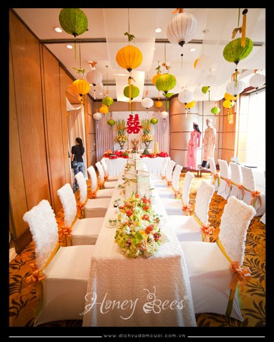 Trang trí lễ gia tiên kết hợp hai tông màu mới cam - xanh cốm HONEY BEES mang đến một phong cách trang trí hiện đại nhưng vẫn mang đạm nét truyền thống của đám cưới Việt
