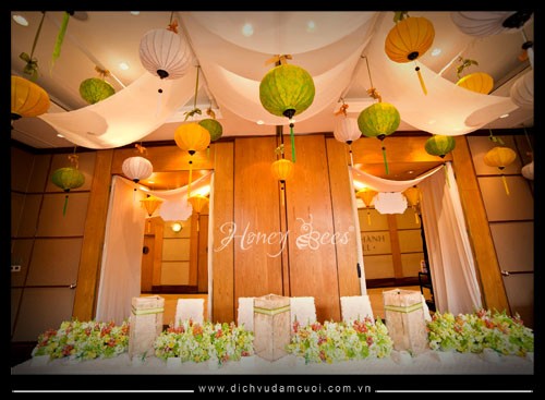Lồng đèn giấy và hoa tươi theo tông màu làm điểm nhấn cho bàn họ