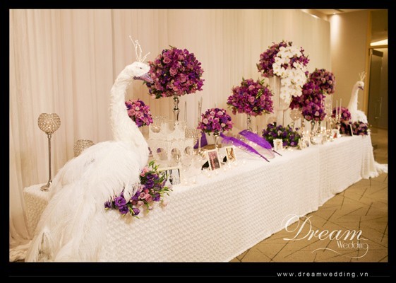 Trong đám cưới Việt Nam, màu tím là một trong số những sắc màu thông dụng nhất. Sắc tím đen đến sự lãng mạn, thích hợp cho những đôi uyên ương chín chắn, ưa chuộng truyền thống, không thích phô trương hay thể hiện quá nhiều về bản thân. Các cô dâu chú rể có thể chọn tông màu tím nhạt, tím pha hồng để trang trí đám cưới, mang đến sắc màu tươi mới cho bữa tiệc.