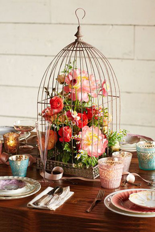 Lồng chim được nhiều cô dâu chú rể lựa chọn để trang trí bàn tiệc style rustic.