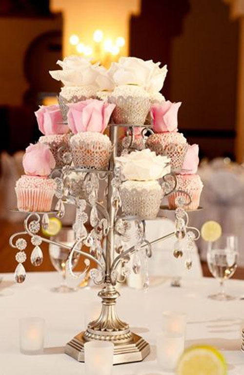 Cupcake được sắp đặt tinh tế trên giá cùng nhiều hạt pha lê lung linh. Điểm nhấn này phù hợp với những cô dâu yêu thích phong cách kẹo ngọt.