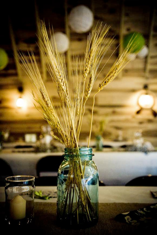 Thay vì hoa tươi, cô dâu chú rể sử dụng bông lúa hay các loại cây cỏ để làm đẹp hoa bàn tiệc và tôn thêm vẻ đẹp mộc mạc của đám cưới.